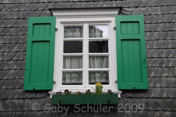 Schiefer und grüne Holzschlagläden